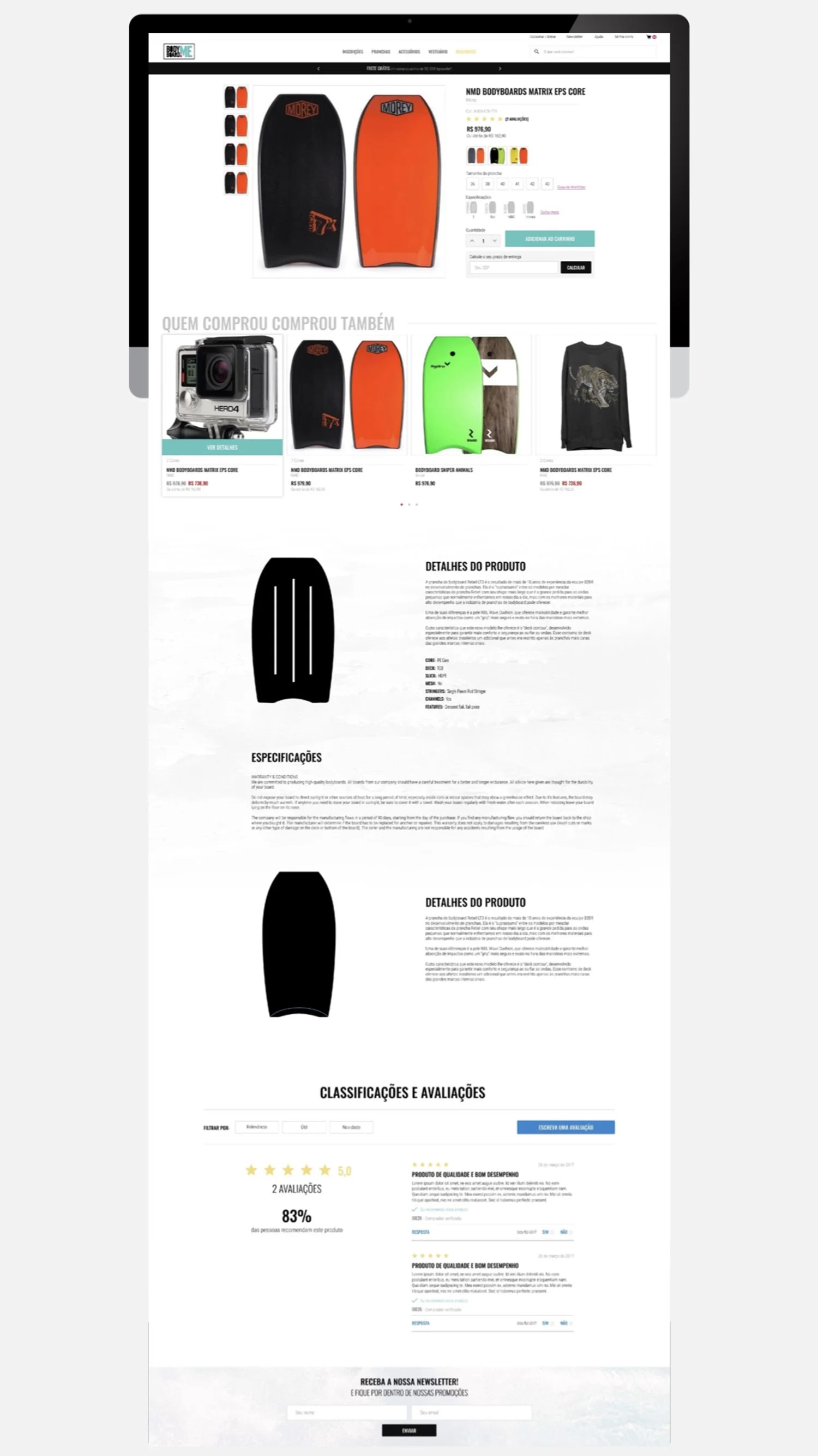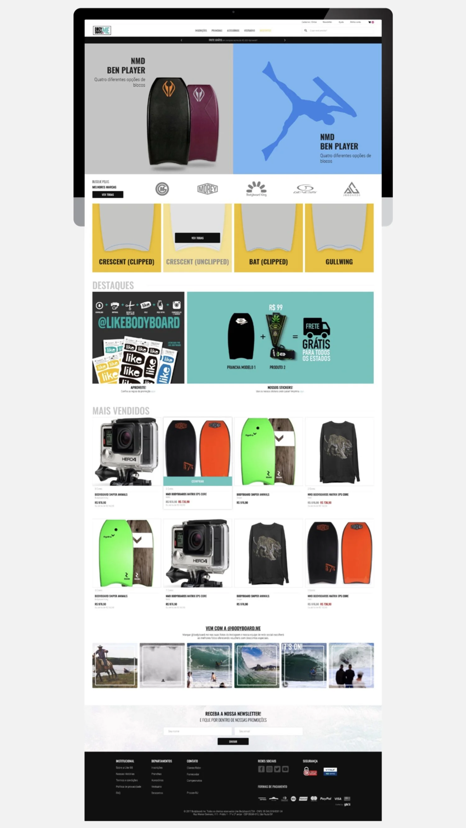 Eram camisas de lycra, camisetas, bonés, quadros, chaveiros, canecas e outros acessórios, para quem curte e compartilha o bodyboard. Esse foi nosso principal gancho do movimento, para incentivar os praticantes a engajarem com os produtos… usamos o mesmo comando do conteúdo.